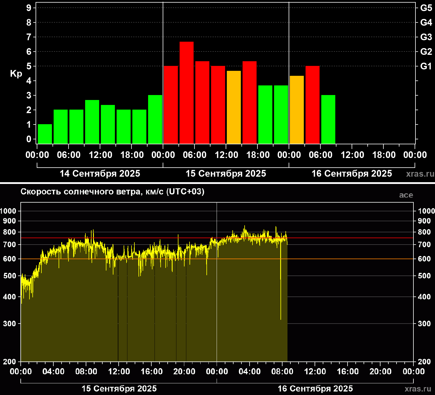 15 сентября 2025 года, с Солнца на нас обрушились штормовые солнечные ветры со скоростью почти «800» км/с (фактическая скорость — «763,3» км/с).