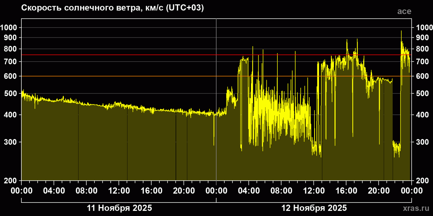 Ранним утром в среду, 12 ноября 2025 года, по прогнозам, мы столкнёмся с очень сильной геомагнитной (радиационной) бурей «G5». Скорость солнечного ветра составляет 738 км/с. (Напоминание: обычная скорость солнечного ветра составляет от 300 до 400 км/с).