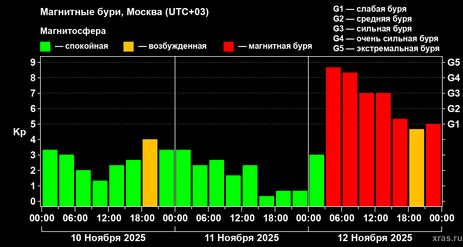 «Индекс KP» получил оценку «8» с пометкой «Шторм». «Индекс KP» рассчитывается главной обсерваторией в Оулу, Финляндия, которая оценивает возмуще