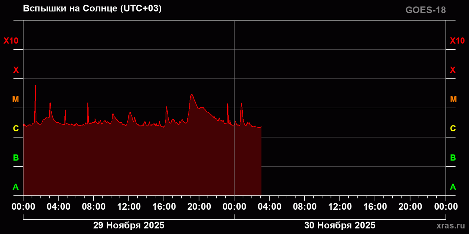 29 ноября, произошли мощные солнечные вспышки класса M1.61 и M5.95, а также вспышка средней силы класса C.7. Некоторые астрофизики из НАСА заявили, что более крупная вспышка класса M на самом деле была вспышкой класса X.