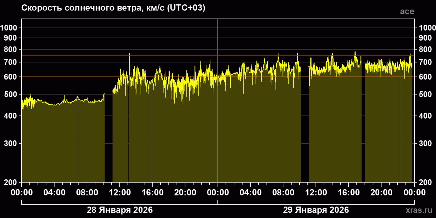 Хотя научные приборы предсказывают относительно спокойный день сегодня, 29 января 2026 года, с точки зрения космической энергетики прямо на Землю направлена солнечная дыра, которая может высвободить достаточно энергии, чтобы вызвать геомагнитную бурю уровня «G1».