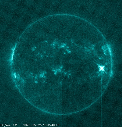 25 мая на Солнце произошла вспышка класса X1.1. X обозначает пятно на этом изображении в экстремальном ультрафиолетовом диапазоне, полученном Обсерваторией солнечной динамики НАСА. Источником взрыва является новое быстрорастущее солнечное пятно 4098. В начале выходных это солнечное пятно было почти незаметным, но теперь его основное ядро больше Земли, а за ним следуют несколько ядер размером с Луну. Излучение от вспышки ионизировало верхние слои атмосферы Земли, что привело к короткому отключению коротковолнового радиовещания над Тихим океаном. Солнечный ветер движется со скоростью 370,7 км/с, плотность: 2,84 протона/см3. | |