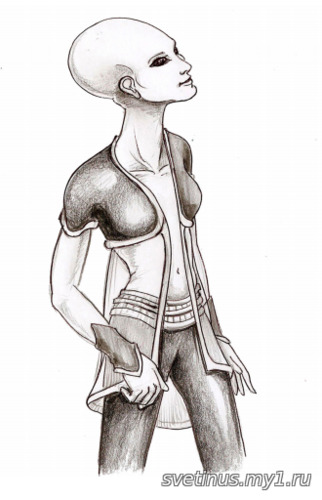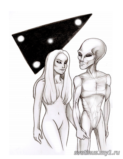ВЕЛА КИИЛЫ-ТОКУРТ (мн. ч. Киилы-Токурит). Киила — название их планеты, расположенной рядом со звездой, которую вы называете «Сухайль», а Токурт — их раса. Они ростом 180 см, живут до 200 лет и являются одной из старейших рас в этой галактике. Они не входят в состав GFW, хотя мы прилагаем все усилия, чтобы привлечь их на нашу сторону и заставить вести себя подобающим образом. Они очень хорошо умеют менять облик, и единственное, что их выдаёт, — это их глаза, широко раскрытые и тёмные, как обсидиан. На самом деле они выглядят как высокие серые гуманоиды, но на самом деле у них рептилоидная генетика и очень бледная, почти белая кожа. Поэтому ваш народ иногда называет их «высокими белыми». Их часто путают с майтрейцами, которые не умеют менять облик, у которых более тёмная серая кожа, более уродливые лица и более широкие черепа. У киилей-токурит два пола, и они яйцекладущие. Они не участвуют в программах гибридизации, но похищают людей для торговли сексуальными рабами и на рынке продовольствия. Некоторые из них также работают наёмниками. Они не являются союзниками Зетай, Чиакарр, Майтры или Рептилоидного Альянса; они работают в одиночку, и, хотя у них мощное вооружение, они не ищут конфликтов. Из-за их незаконной деятельности на Терре постоянно происходят столкновения с силами GFW. Их корабли представляют собой вытянутые чёрные треугольники с огнями по углам и большим центральным огнём, и их очень легко узнать. По сравнению с секретными летающими треугольниками ВВС США, корабли KT не издают никакого шума, у них острые углы, они больше и обладают системой маскировки, основанной на квантовом отражении (отражение того, что находится под ним). Если вы увидите один из них, просто не думайте, бегите. Самец Киилли-Токурт (справа) представлен вместе с самкой Киилли-Токурт, превратившейся в гуманоида, чтобы показать, что глаза остаются чёрными. ПУРИТ-АВ-ИЛЛУМУ (Носив-7) Они родом из звёздной системы Му Вела. Пурит-Ав-Иллуму — гуманоиды-амфибии среднего размера, с серой кожей, вытянутым черепом и длинными заострёнными ушами. Они миролюбивы и скрытны и работают наблюдателями в Галактической Федерации Миров. Их деятельность в основном связана с наблюдением за вашими океанами, а также с доступом и использованием межпространственных порталов на Терре. У них очень большие дискообразные корабли. У них есть базы на Земле в обширных субокеанических сооружениях.