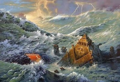 Горящая территория Центральной Атлантиды, вздымая облака черного дыма и коричневого пара, исчезла в открытых водах океана. В Северной и Южной частях образовались два больших острова, а затем три поменьше. Начался всемирный потоп. Гигантский Огненный Кристалл опустился на дно моря. Даже сегодня, когда Солнце и Луна расположены определенным образом, они излучают смертельные вибрации. Сотни кораблей и самолетов нашей пятой расы в районе Бермудского треугольника падают в яму, вырытую тысячи лет назад. Взрыв Третьей Атлантиды вызвал чудовищные потрясения всей земной коры. Три волны обрушились на континенты, унося с собой города и страны. Вулканы проснулись. Части континентов распались и ушли на дно океанов, а вместо них выросли новые земли…